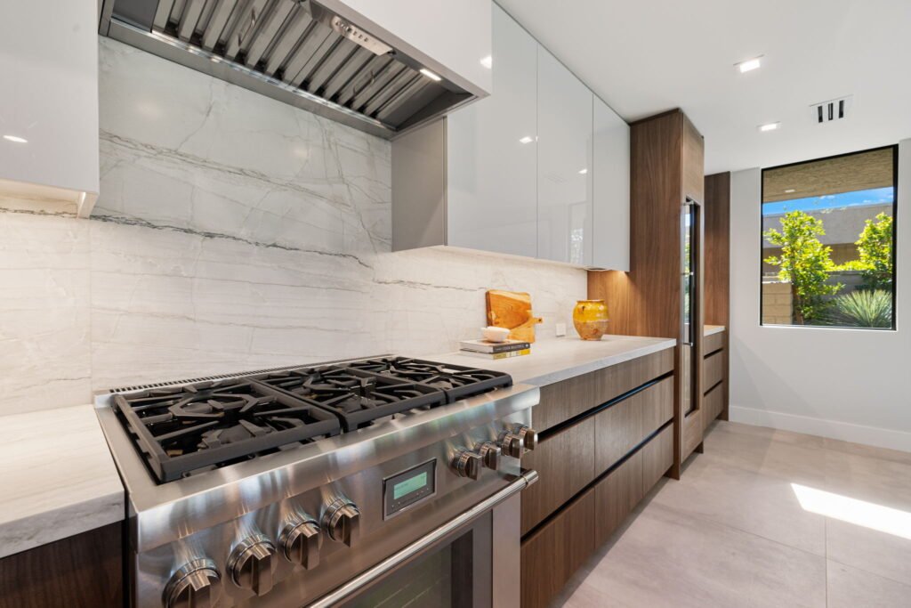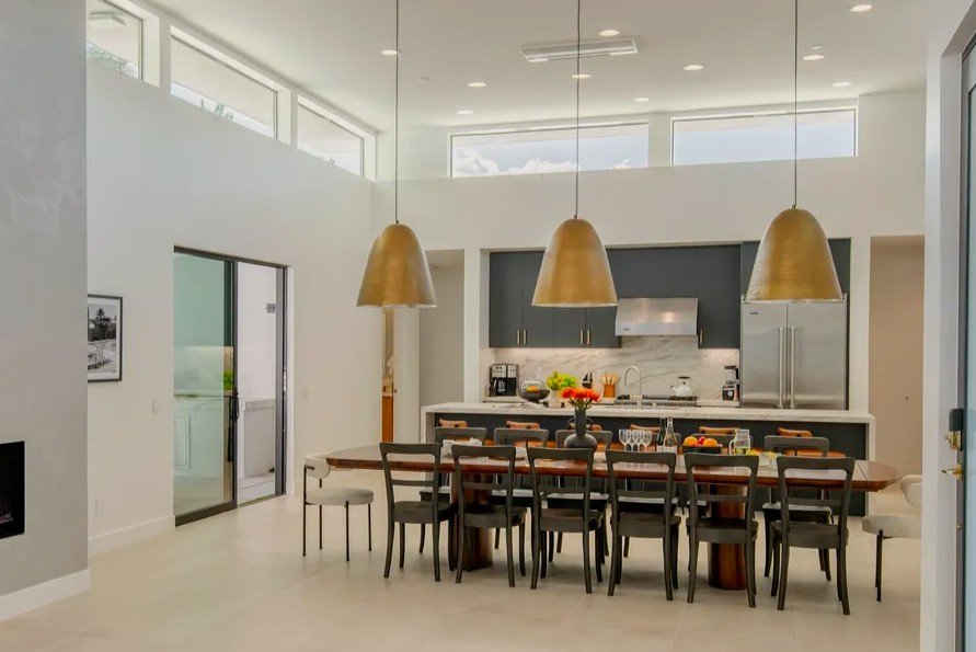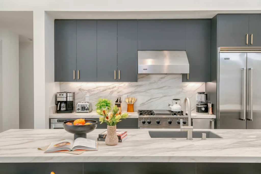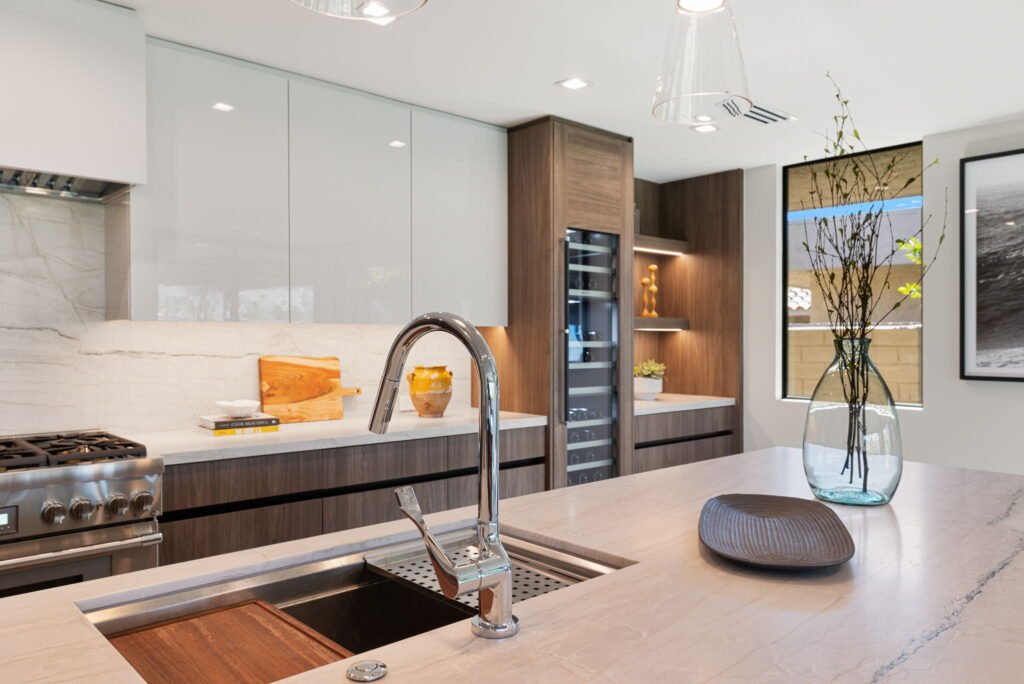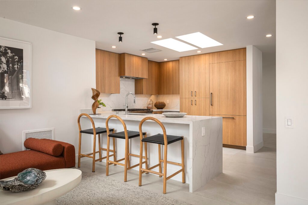 Develop a kitchen that emphasizes sleek minimalism, architectural drama, and contemporary refinement. Give the space a more grounded and cozier feel to open up other rooms.
