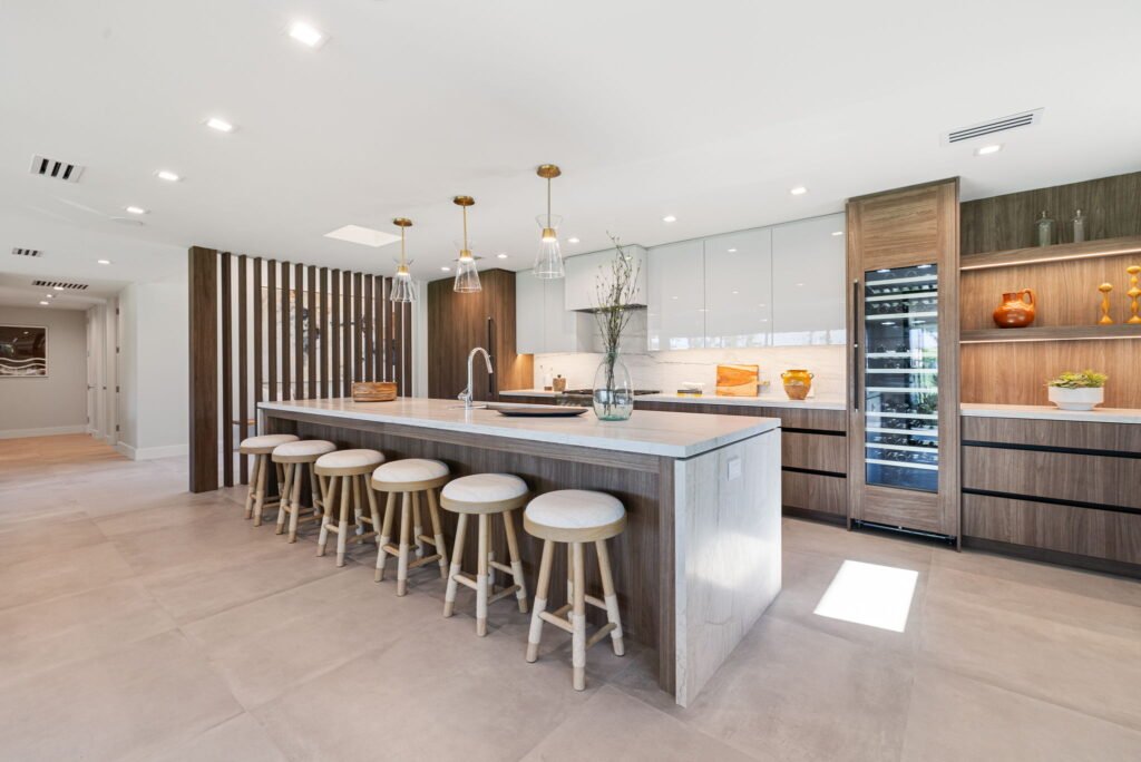 The mix of Acerno by Cleaf and High Gloss Light Grey by Mirlux deliver a high-end, customized look that is visually dynamic, blending warmth with sleek modernity.